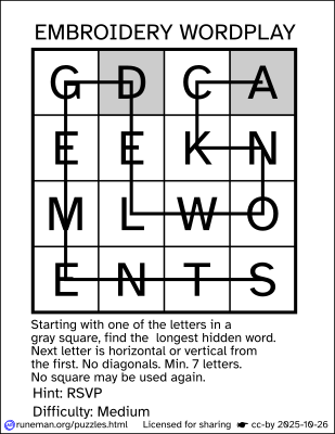 The puzzles are Creative Commons Attribution licensed which means you can use each of them as you wish, as long as you credit me as the author of the puzzle. Links back to the site are appreciated, but not needed. I would love to hear from you if you enjoy these puzzles. The easiest way is through my federated social media account at Mastodon.art.