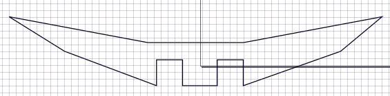 Even though this section is about the mouth, it will be a little easier to first look at the polygon code for the triangle nose with only three points. polygon([points],[paths],convexity) For every polygon, there are three elements: a series of "points", each described by the two numbers we collected from our graph paper; a list of the "paths" by listing our points' index numbers; and a convexity value. The punctuation is very picky. Notice that the whole set of points is in a pair of square brackets, while each bracketed point is separated by a comma from the next bracketed point, and that the path list is again enclosed with a double pair of square brackets. The convexity value is generally "safe" with a value of ten. Convexity basically is a count of how many times a straight line can cross through an "edge" of the polygon. In the illustration just below, you can see the blue line crosses an edge only six times. A value of ten is "safe" for most polygons I've used, and the extra convexity count does not noticably slow down the code.