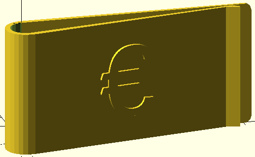 For text decorations, adjust the size of the text as needed. The use of str("$") as part of the text command allows for using unicode to give us other money symbols like the Euro, Pound and Yen. For example, the Euro is str("\u20ac"), substituting the "escaped" unicode for the dollar sign between the quotes. There are quick-print STL files included for dollar, euro, pound and yen/yuan. Other symbols are available. Do a search for "unicode for money symbols" to get a list. An entry may be shown as U+20A3 for the French Franc ( ₣ ) which you would enter as str("\u20a3"). Make your modification in the moneycllip-basic.scad file.