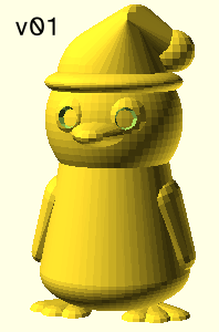 Detail modifications often continue beyond the first "good enough" design and print. One thing which bothered me was how small this design came out. Fortunately scaling is easy using most slicer software running on your printer. Nonetheless, It seemed worth doubling the height of the "basic" design. That was one of the version04 steps. The design is not "perfect" and you may avoid minor points of filament sag under the hat's pom-pom, beak and between the feet if you enable your slicer software support option. I was happy enough "as-is" to scrape away the small amount of sag with a knife blade.