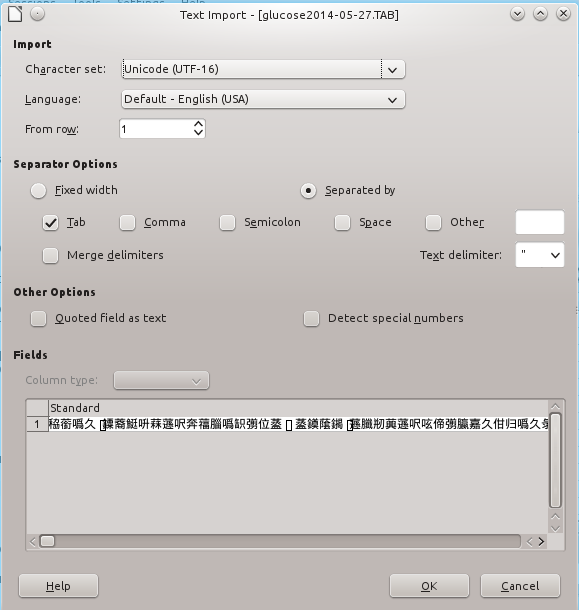 I export my glucose readings from the testing meter so I can report them to my doctor. The export file is a tab-delimited text file which is common as a way to get data ready for import into a spreadsheet like LibreOffice Calc. I like to add my food records to the plain glucose readings from the meter. Calc also lets me caluclate averages, high and low readings, etc..